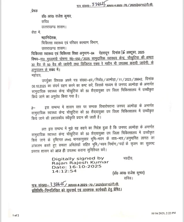 चौखुटिया अस्पताल के लिए 50 बेड मंजूर, मुख्यमंत्री धामी ने स्वास्थ्य विभाग के सचिव से जवाब तलब कर फाइल लटका होने पर नाराजगी जताईपूरी खबरदेहरादून। मुख्यमंत्री पुष्कर सिंह धामी ने चौखुटिया में 30 बेड के सामुदायिक स्वास्थ्य केंद्र (CHC) को 50 बेड के उपजिला अस्पताल (SDH) में उच्चीकृत करने की योजना को मंजूरी दी है। उन्होंने स्वास्थ्य विभाग के सचिव से इस मामले में जवाब तलब किया है कि यह महत्वपूर्ण फाइल एक साल से क्यों और कहां लटकी रही।मुख्यमंत्री धामी ने कहा कि अल्मोड़ा जिले के चौखुटिया क्षेत्र में अस्पताल की सुविधाओं में बढ़ोतरी बहुत आवश्यक है, परंतु पिछले एक साल से यह मामला फाइलों में उलझा हुआ रहा। उन्होंने कहा कि सचिवालय में फाइलों का यह अटका रहना अनुचित है और ऐसे मामलों में समयबद्ध कार्रवाई होनी चाहिए।चौखुटिया क्षेत्र में भवन और अन्य सुविधाओं की कमी को उच्चीकरण प्रक्रिया में बाधा बताया गया है, लेकिन मुख्यमंत्री ने स्पष्ट किया कि स्वास्थ्य सेवाओं की गुणवत्ता और उपलब्धता में कोई कोताही बर्दाश्त नहीं की जाएगी। उन्होंने अल्मोड़ा में अज्ञात बीमारी से हुई मौतों का मामला भी उठाया और अनुभवी चिकित्सा दल भेजने के निर्देश दिए।सीएम धामी की इस सख्त चेतावनी के बाद अस्पताल के उच्चीकरण का प्रस्ताव शासन स्तर पर तेजी से आगे बढ़ रहा है। यह कदम स्थानीय जनता के लिए राहत की बात है, क्योंकि इससे क्षेत्रीय स्वास्थ्य सुविधाओं में महत्वपूर्ण सुधार होगा और चिकित्सकीय सेवाएं बेहतर होंगी�