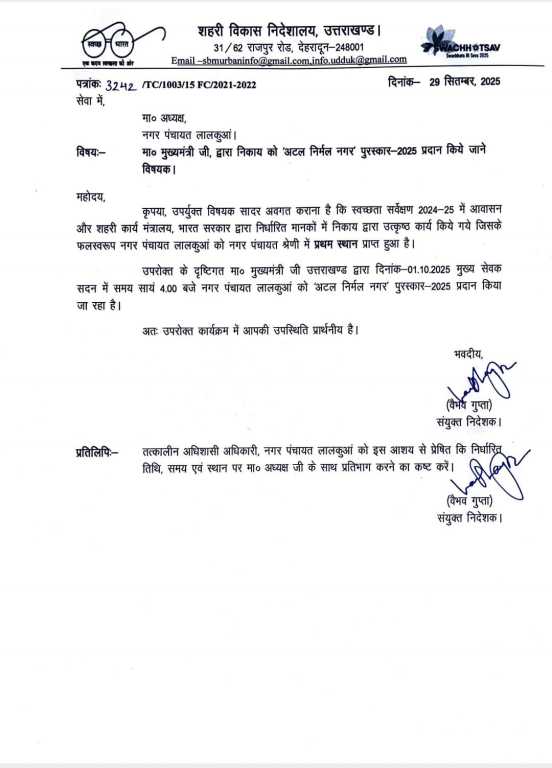 लालकुआं नगर पंचायत ने स्वच्छता के क्षेत्र में नया कीर्तिमान स्थापित करते हुए अटल निर्मल पुरस्कार 2025 में प्रदेशभर में पहला स्थान हासिल किया है। इस उपलक्ष्य में नगर पंचायत का सम्मान समारोह कल 1 अक्टूबर 2025 को शाम 4:00 बजे मुख्य सेवक सदन, देहरादून में आयोजित होगा।नगर पंचायत को यह सम्मान जनता की सक्रिय भागीदारी और निरंतर सहयोग से प्राप्त हुआ है। स्वच्छता अभियान को जन-आंदोलन का स्वरूप देने में नगर पंचायत अध्यक्ष श्री सुरेंद्र सिंह लोटनी के नेतृत्व और प्रयासों की महत्वपूर्ण भूमिका रही है। लोटनी ने अपने कार्यकाल में नगर की सफाई व्यवस्था में व्यापक सुधार के साथ-साथ पर्यावरण संरक्षण और जन-जागरूकता अभियानों पर विशेष ध्यान दिया। उनका लक्ष्य लालकुआं को न केवल स्वच्छ बनाना है, बल्कि यहाँ के नागरिकों में साफ-सफाई की आदत को स्थायी रूप से विकसित करना भी है।अध्यक्ष सुरेंद्र सिंह लोटनी और नगर पंचायत प्रशासन ने इस उपलब्धि को लालकुआं की पूरी जनता को समर्पित किया है। उन्होंने नगरवासियों का आभार व्यक्त करते हुए कहा कि लालकुआं को स्वच्छ बनाने में हर नागरिक का योगदान सराहनीय रहा है। साथ ही उन्होंने अपील की कि भविष्य में भी सभी लोग इसी तरह मिलकर सहयोग करें, ताकि लालकुआं पूरे प्रदेश ही नहीं बल्कि देश का स्वच्छतम नगर बन सके।