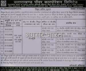 विद्युत विभाग द्वारा जारी विज्ञप्ति में बताया गया है कि क्षेत्र की विद्युत लाइनों के रख-रखाव और आवश्यक मरम्मत कार्यों के कारण बिजली आपूर्ति बाधित रहेगी। विभाग ने क्रमशः 18 दिसंबर से 22 दिसंबर तक का विस्तृत शेड्यूल सार्वजनिक किया है, ताकि उपभोक्ताओं को किसी भी प्रकार की असुविधा न हो।