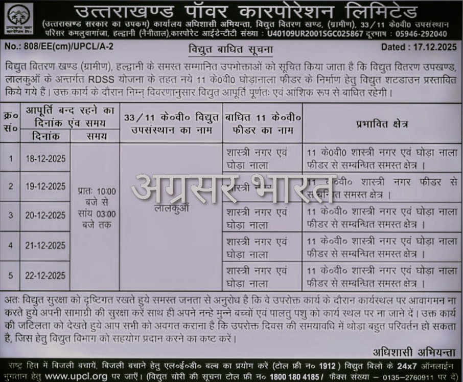 विद्युत वितरण खंड हल्द्वानी ग्रामीण ने स्पष्ट किया है कि यह कटौती सिस्टम की मजबूती के लिए अनिवार्य है। कटौती का सटीक समय और संबंधित फीडर की जानकारी के लिए विभाग द्वारा जारी आधिकारिक आदेश की प्रति नीचे संलग्न है ।