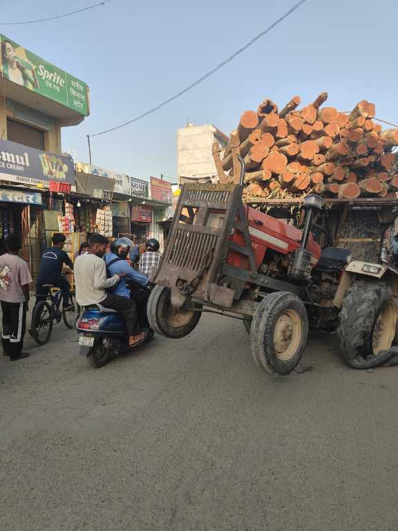 लालकुआं के कार रोड बाजार में आज प्रशासन की नाक के नीचे कानून की धज्जियां उड़ती देखी गईं। एक बिना नंबर प्लेट के ओवरलोड ट्रैक्टर ने बीच बाजार में ऐसा तांडव मचाया कि राहगीरों की जान हलक में आ गई। ओवरलोडिंग के कारण चलते ट्रैक्टर के अगले दोनों टायर हवा में उठ गए, जिससे बाजार में भगदड़ मच गई और यातायात पूरी तरह अस्त-व्यस्त हो गया।
