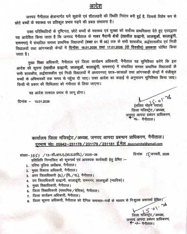 उत्तराखंड के मैदानी इलाकों में पड़ रही भीषण ठंड और घने कोहरे को देखते हुए जिला प्रशासन ने बच्चों की सुरक्षा के लिए बड़ा कदम उठाया है। जिलाधिकारी नैनीताल ने जनपद के भाबर (मैदानी) क्षेत्रों में संचालित सभी प्राथमिक विद्यालयों और आंगनबाड़ी केंद्रों में 16 और 17 जनवरी को दो दिवसीय अवकाश घोषित कर दिया है।