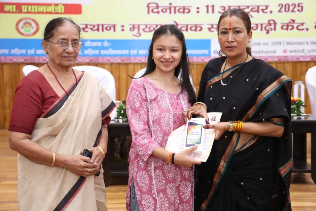इंटरमीडिएट टॉपर आयुषी भट्ट को स्मार्टफोन पुरस्कार प्रदान करती कैबिनेट मंत्री रेखा आर्या — साथ में अन्य सम्मानित अतिथि।
